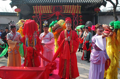 为了增添景区文化氛围,丰富游客的旅游活动,无锡基地将在2007年春节期间(正月初一至初七)举办"重返宋朝过大年"活动,带领游客穿越时空,过一个别有特色的宋朝春节。活动期间,无锡基地将在水浒城隆重推出"武二郎娶亲"参与式表演。游客在游览水浒城时,不仅能充分感受宋朝过新年的热闹气氛,还可亲自体验、参与宋朝迎亲的喜庆场面"迎亲"活动定于每天上午9∶15和下午2∶45举行,婚礼司仪将在游客中挑选年轻小伙作为新郎官,精心装扮后,与唢呐手、花轿等人共同组成浩浩荡荡的迎亲队伍,由紫石街,经王婆茶馆、武大郎家到达新娘家--阳谷县衙。新郎必须经过文试、武试及伴娘的三关考试后,才能顺利请出新娘与其举行三拜大礼。