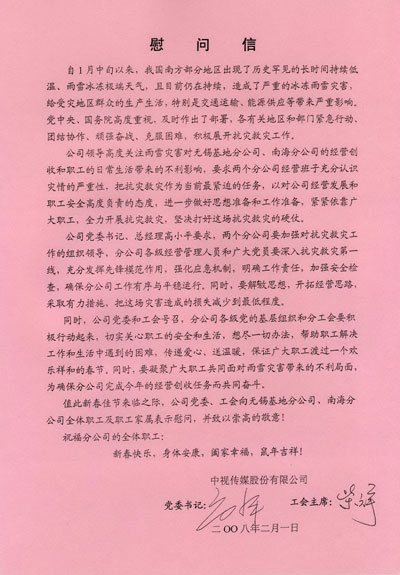 公司党委和工会已分别向两个分公司的全体干部职工发出了慰问信,号召分公司各级党的基层组织和分工会积极行动起来,想尽一切办法,帮助职工解决工作和生活中遇到的困难,传爱心、送温暖,保证广大职工渡过一个欢乐祥和的春节。
