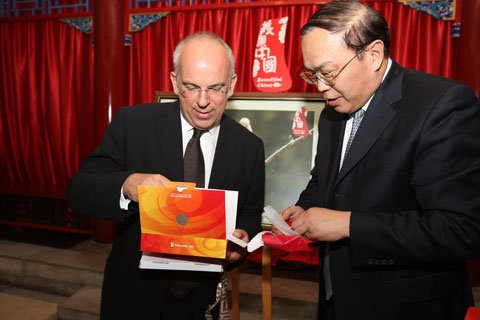 台分党组成员、中视传媒股份有限公司董事长李建(右)和BBC环球公司首席执行官John Smith(左)在招待晚宴上互赠礼物。