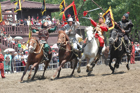 大型古战争表演《三英战吕布》博得荣誉市民们的阵阵喝彩。