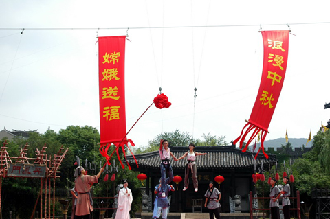 活动期间,无锡影视基地每天在《三英战吕布》开演前,举行“嫦娥送福”活动,活动中“吴刚”带领游客进行对歌、对诗、对对联、对词、猜谜等极具中秋色彩的互动游戏,坐着马车的“嫦娥”携带着中秋祝福款款而来,为幸运的游客送上特别的中秋礼物;在水浒城《影视特技探索》演出开始前,“吴刚”向着天空迎接远道而来的搭档“嫦娥”,两人带领当场选出的幸运游客上演“嫦娥奔月”,共同感受温馨浪漫的中秋氛围。