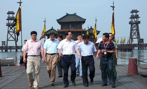 无锡市委常委、宣传部长王立人(左四)在三江口吴营码头,听取公司副总经理、无锡影视基地总经理许一鸣(左二)关于"十一"节各项准备工作的介绍。
