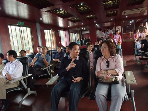 国家旅游局质量规范与管理司副司长薛桂凤(右一)在公司副总、分公司总经理许一鸣(左二)陪同下,在三国吴营码头登船考察。