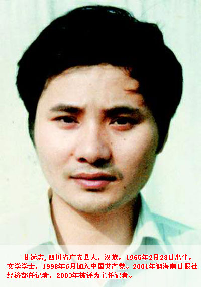 一个记者,以他特有的完美姿态,最后定格在自己的岗位上。9月4日,当《尽快启动大广坝二期工程》的消息在海南日报头版显著位置刊登时,该文作者、海南日报经济部主任记者甘远志,却在他发出消息的工作现场,静静地走了。在此岗位三年里所采写的1051篇报道中,此文成了他的绝笔。他以文章证明自己的价值,他以文章向人们最后道别。