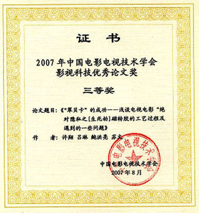 近日,中视传媒股份有限公司控股子公司——北京中视北方影像技术有限责任公司许翔、吕琳、鲍洪亮等合著的论文《翠贝卡的成功——浅谈电视电影〈绝对隐私之生死劫磁转胶的工艺过程及遇到的一些问题〉》,荣获2007年中国电影电视技术学会影视技术优秀论文三等奖,同时收录在该学会主编的《影视技术文集(2007)》中。