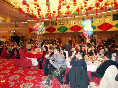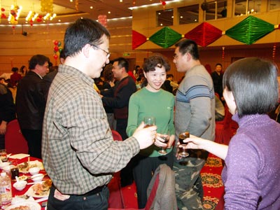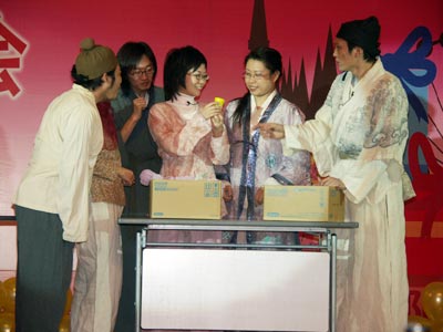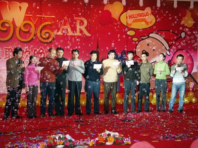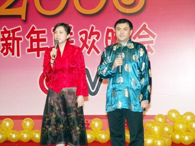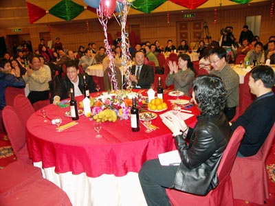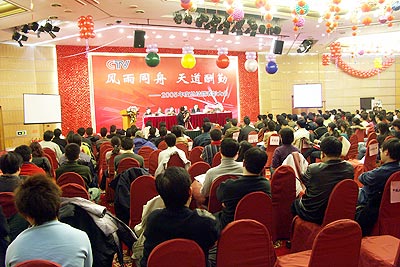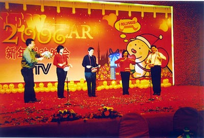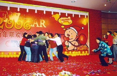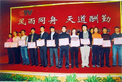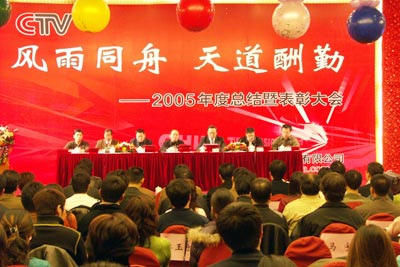 中央电视台分党组纪检组组长、台机关党委书记、公司监事会主席张海鸽(前桌左三),中央电视台分党组成员、中国国际电视总公司总裁李建(前桌左二)和公司高管人员一起观看节目