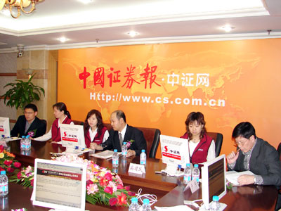 参加网上路演活动的嘉宾有:中央电视台分党组成员、副台长李晓明(中),中视传媒公司董事长高建民(左三),董事、总经理高小平(右三)、总会计师柴竫(右二)、董事会秘书卢芳(左二),海通证券投行部总经理助理张均宇(右一),海通证券保荐代表人周威(左一)