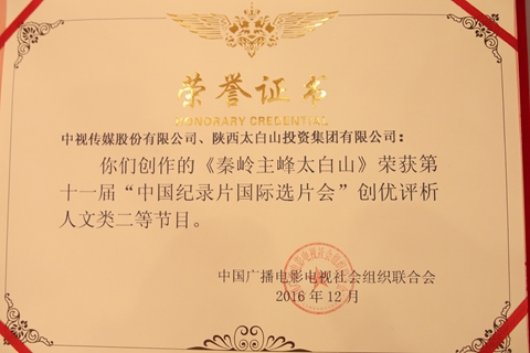 12月24日,由中视传媒联合陕西太白投资集团投资出品的纪录片《秦岭主峰太白山》荣获第十一届“中国纪录片国际选片会”创优评析人文类二等奖。