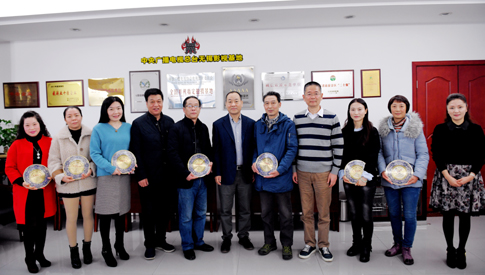 为退休员工发放光荣退休纪念品并合影留念