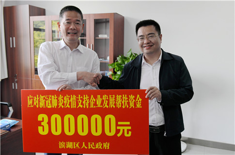 无锡市滨湖区副区长周俊鹏(右)送应对新冠帮扶资金