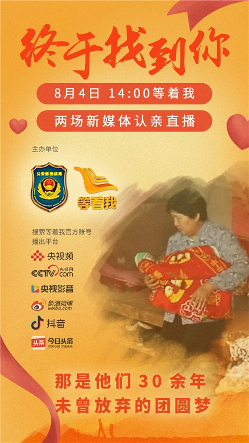 2020年8月4日14:00,《等着我》将在河北邯郸对苏海英寻亲及孙少虎寻亲进行现场独家直播。
