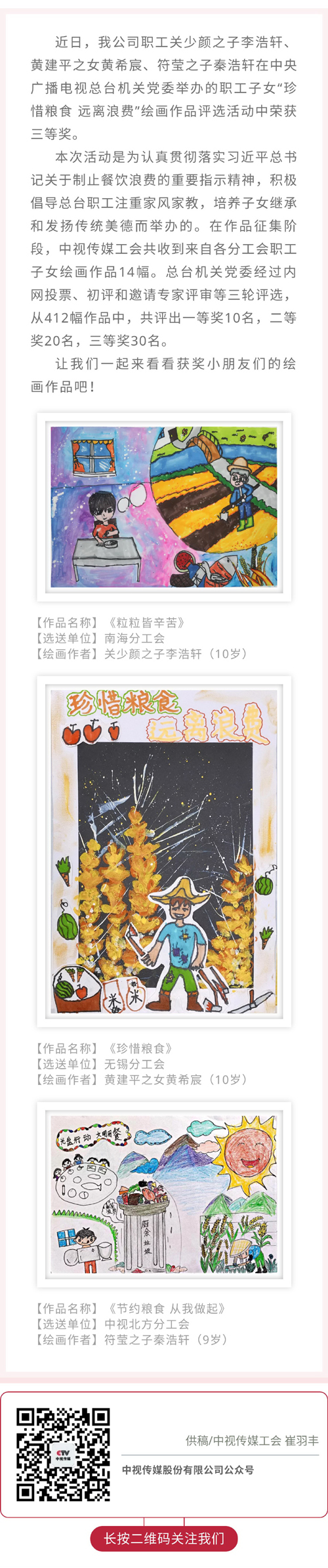我公司职工子女在总台举办的“珍惜粮食 远离浪费”职工子女绘画比赛中荣获三等奖