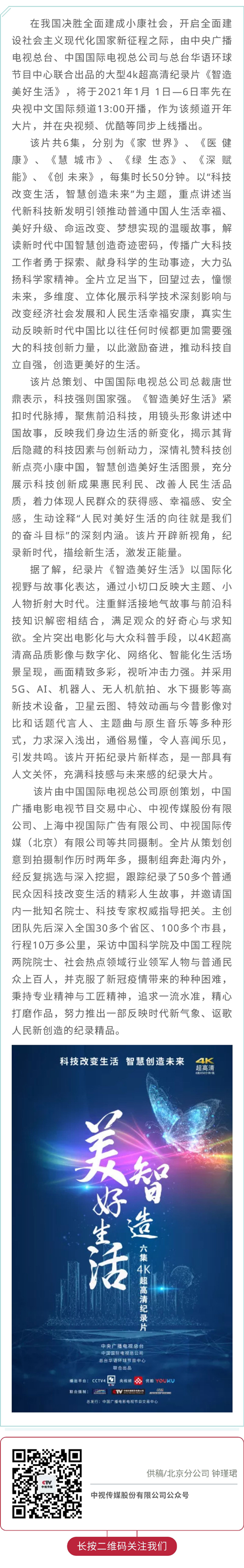 中视传媒参与摄制大型4k超高清纪录片《智造美好生活》央视新年首播