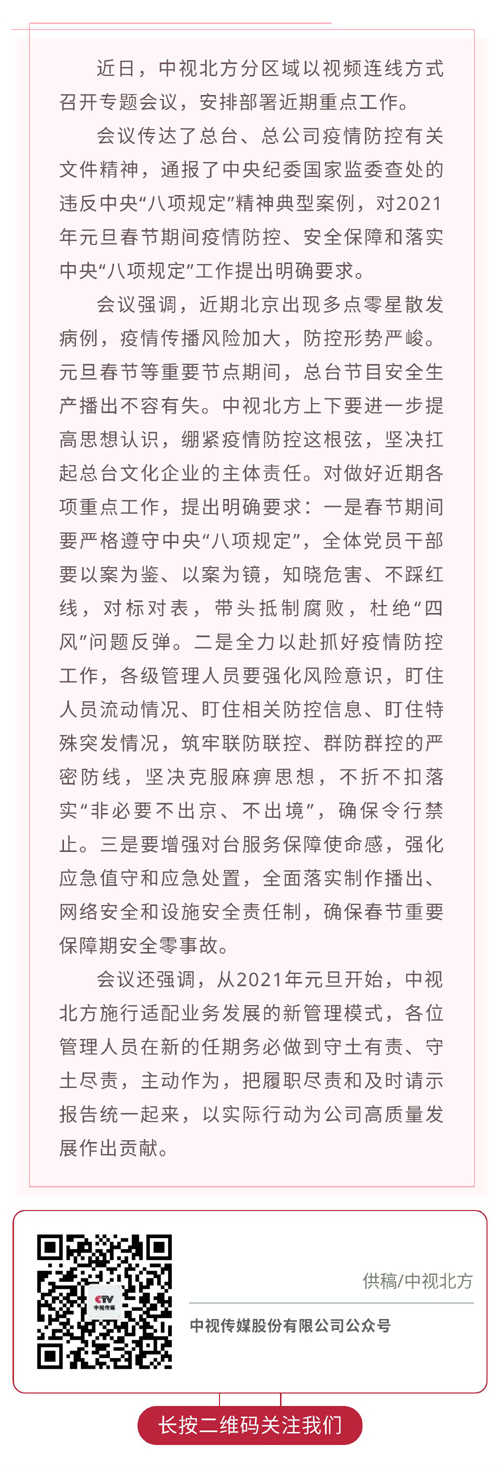 中视北方传达总台总公司文件精神统筹部署近期疫情防控、安全保障及落实中央“八项规定”工作
