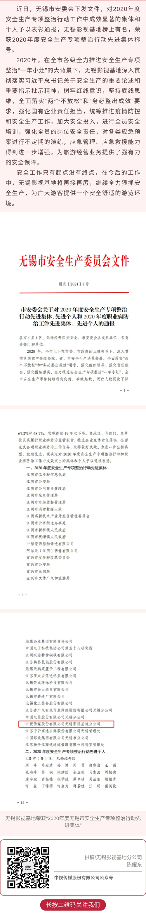 无锡影视基地荣获“2020年度无锡市安全生产专项整治行动先进集体”