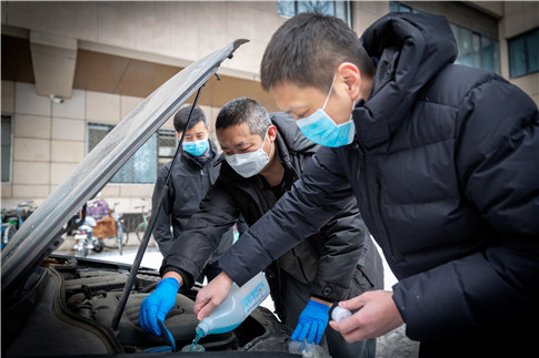 班车志愿者司机董磊(右)汤寅(中)正在检查车况