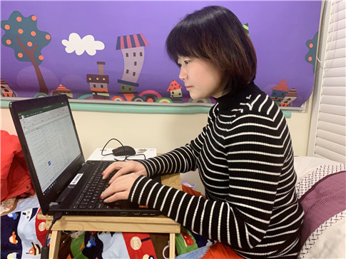 办公室副主任许萍哄睡孩子,复核一天的数据