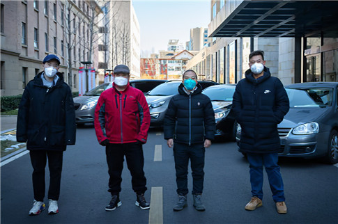 第一批班车志愿者(左至右:节目制作部张健玮、制作四部马剑、包装四部任民、销售部任帅)